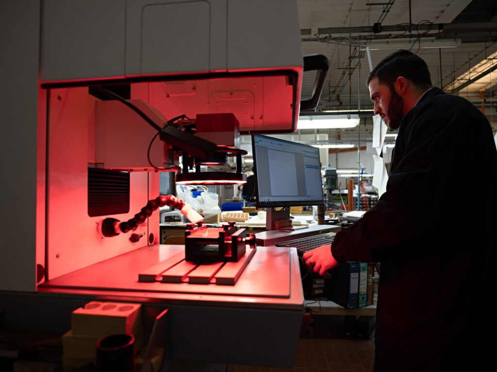 Il laser è particolarmente efficace per realizzare loghi, trame decorative, numerazioni seriali o micro-dettagli impossibili da ottenere con metodi tradizionali. Ma trova impiego anche nella fase di pre-taglio o sagomatura di componenti complessi, riducendo tempi e margini di errore.
